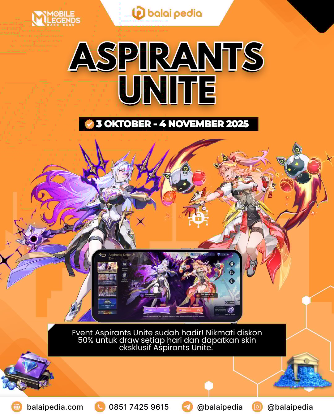 Periode: 3 Oktober – 4 November 2025 Diskon 50% untuk draw setiap hari — jangan sampai terlewat! 10x Draw Pertama akan mendapatkan skin Epic