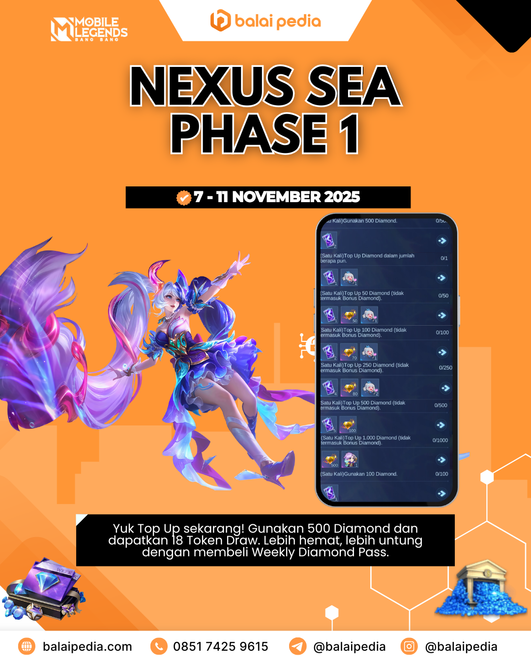 Bonus Top up Phase 1 Sudah Hadir Top up dan gunakan diamond sebanyak 500 bisa mendapatkan total 18 token draw, lebih hemat beli weekly diamond pass.